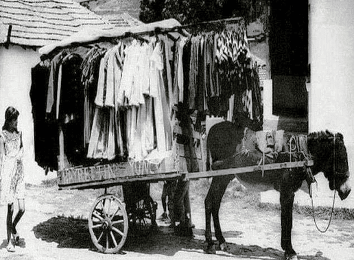 Fotoğraf, tekstil işinin bir eşek arabasında yapılışının görüntüsüydü.