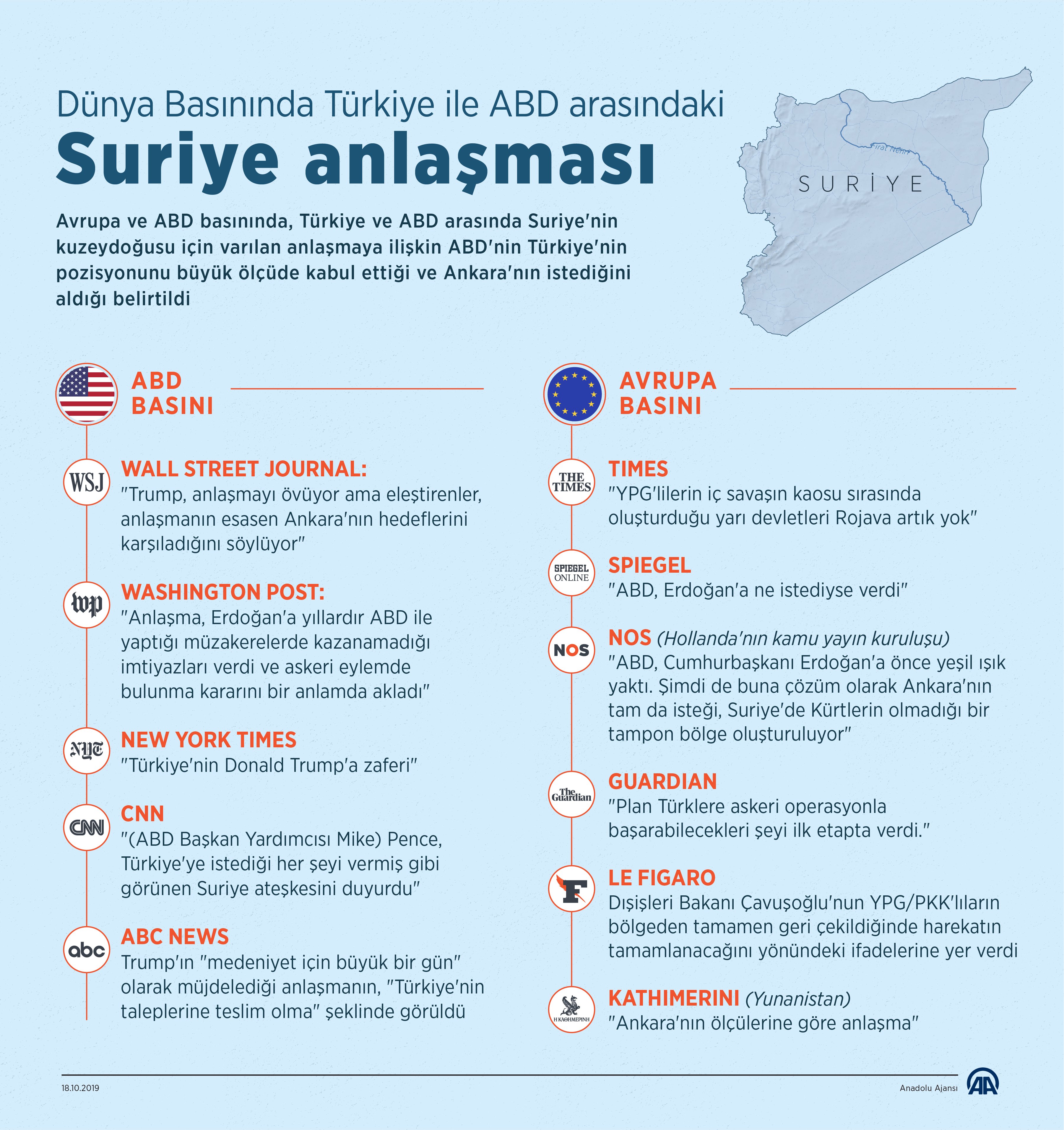 İngiltere, Almanya, Fransa gibi Avrupa ülkelerindeki gazeteler, “PKK/YPG’nin 120 saat içinde güvenli bölgeden çıkması için Barış Pınarı Harekatı’na ara verilmesi” konusunda vardığı anlaşmaya sayfalarında geniş yer verdi.