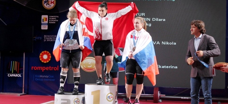 Romanya’da düzenlenen Gençler ve 23 Yaş Altı Avrupa Halter Şampiyonası’nda genç kadınlar 76 kiloda Dilara Narin, koparma, silkme ve toplamda altın madalya kazandı.