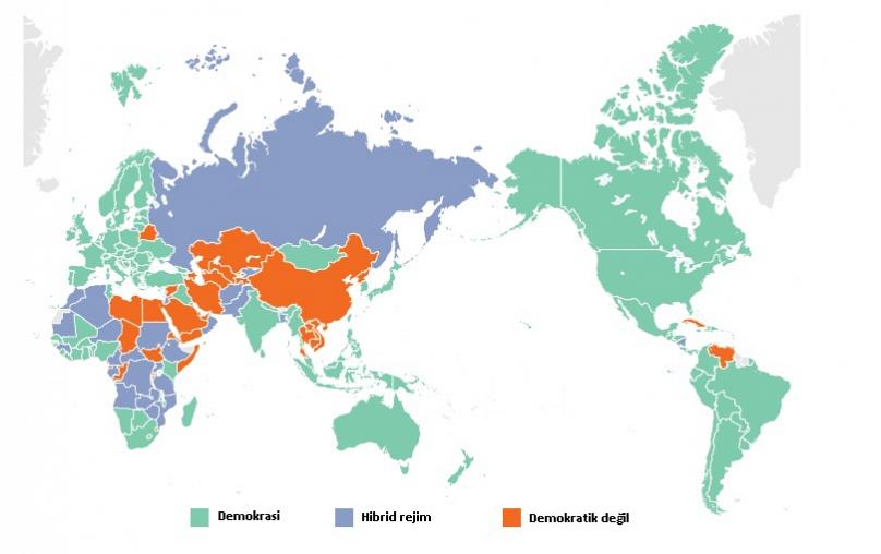 1975’te dünyadaki ülkelerin sadece yüzde 26’sı demokratik iken bu sayı 2018’de yüzde 62’ye kadar çıktı. Demokratik olarak kabul edilen ülke sayısı 97. 1975’te dünya nüfusunun yüzde 36’sı demokratik bir ülkede yaşarken bu oran 2018 yılında yüzde 57’ye yükseldi. Demokratik olmayan ülke sayısı 1975’te yüzde 68 iken bu sayı 2018 sonunda yüzde 20’ye kadar geriledi.
