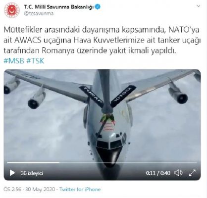 Bakanlığın Twitter hesabından yapılan açıklamada, “Müttefikler arasındaki dayanışma kapsamında, NATO’ya ait AWACS uçağına Hava Kuvvetlerimize ait tanker uçağı tarafından Romanya üzerinde yakıt ikmali yapıldı” ifadesine yer verildi.