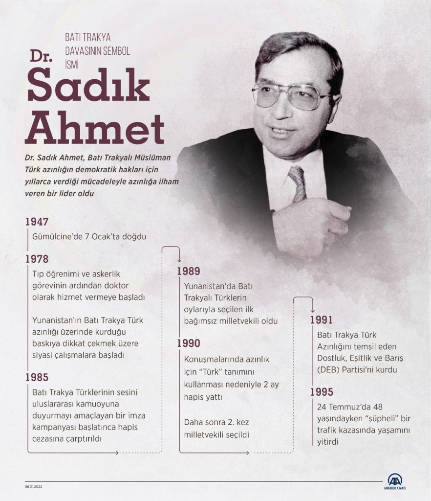 Dr. Sadık Ahmet’in Yunanistan parlamentosunda görev yapmış ilk bağımsız Batı Trakya Türk Vekili olduğuna dikkati çeken Erdem, “Batı Trakya Türklerinin sorunlarını uluslararası platformlara taşımakta Dr. Sadık Ahmet’in rolü yadsınamaz. Doktor Sadık Ahmet’le birlikte Batı Trakya Türklerinin kimlik ve hak mücadelesi farklı bir nitelik kazanmıştır.” ifadelerini kullandı.