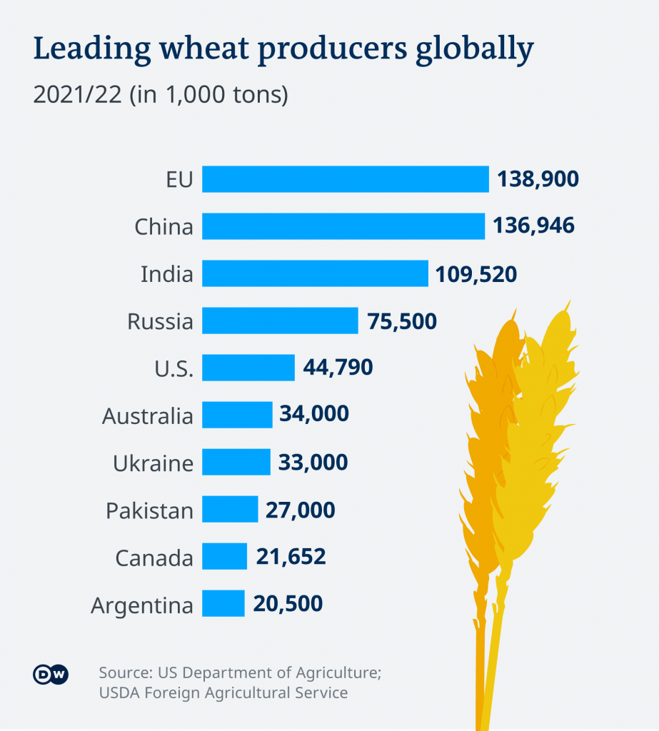 Almanya Federal Ekonomik İşler ve İhracat Kontrol Ofisi’ne göre, Ukrayna’nın buğday üretimi dünya pazarının %11,5’ini oluştururken, Rusya’nın payı ise %16,8. Mısır söz konusu olduğunda, Ukrayna dünya ihracat pazarının %17’sini karşılamaktadır.
