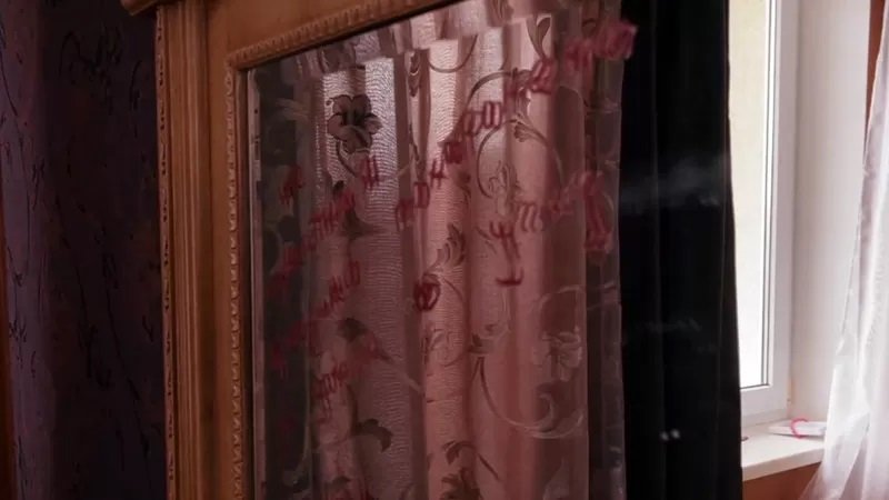 Köşedeki aynaya ise rujla, “Bilinmeyen kişilerce işkenceye uğradı, Rus askerlerince gömüldü” yazılmış.