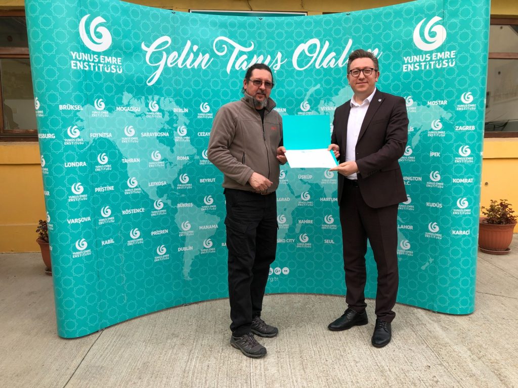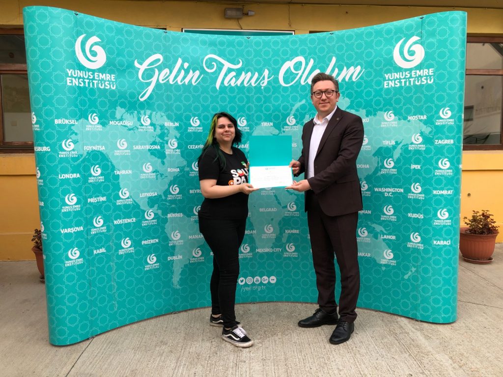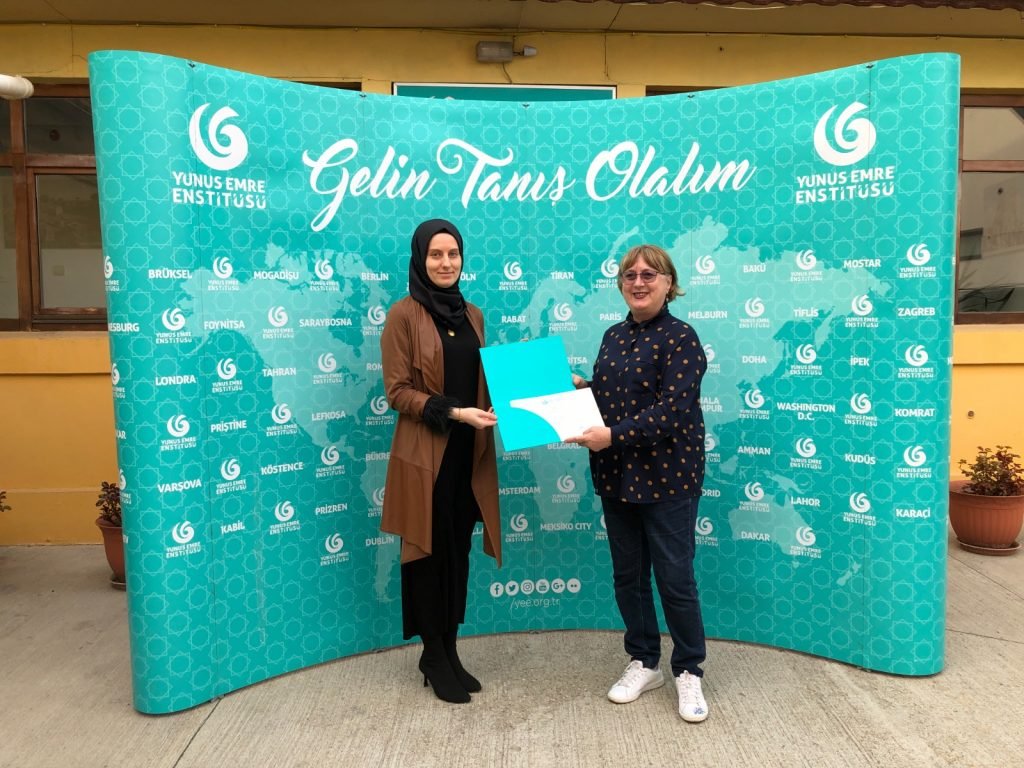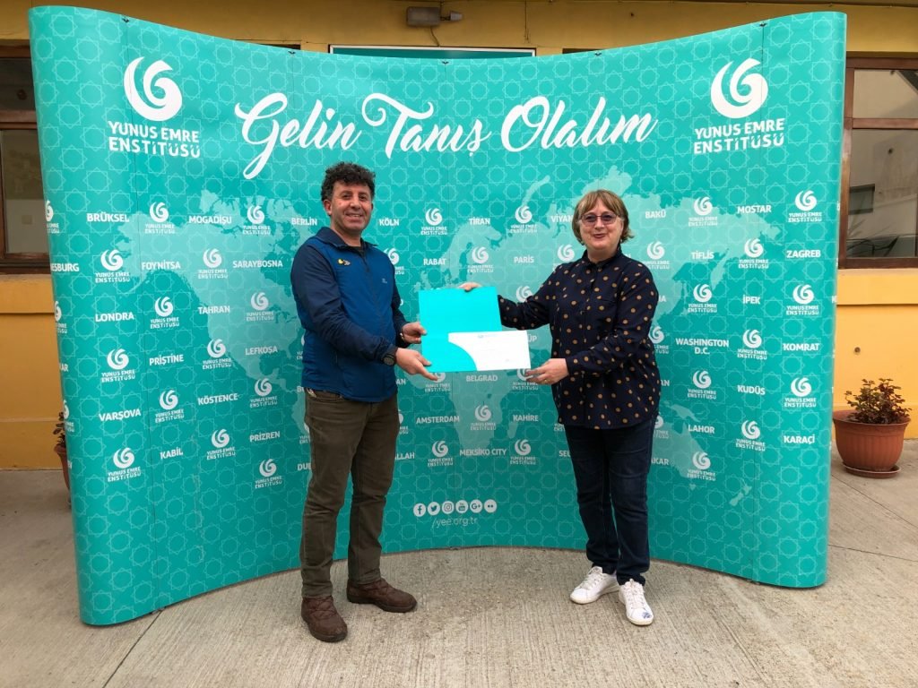 Kültür sanat faaliyetleri kapsamında Bükreş Yunus Emre Enstitüsünde Rumenlerin büyük ilgisiyle başlayan Ebru Sanatı kursun ilk dönemi sona erdi ve sertifika almaya hak kazananlara sertifikaları Bükreş YEE Müdürü Mustafa Yıldız ve Ebru Sanatı eğitmeni Rodica Parvan tarafından takdim edildi.