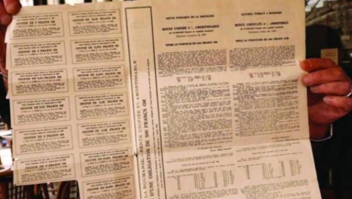 Fransa’nın başkenti Paris’te ikamet eden 82 yaşında emekli hukuk danışmanı ve iş insanı Henry B., 1929’da çıkarılan ve hamiline ödenen türden olan tahvilin bedelini almak için Romanya devletine başvurdu. Tahvilin arkasında yazan ibare ise, Romanya’nın kamu borcuna karşılık geldiğini gösteriyor.