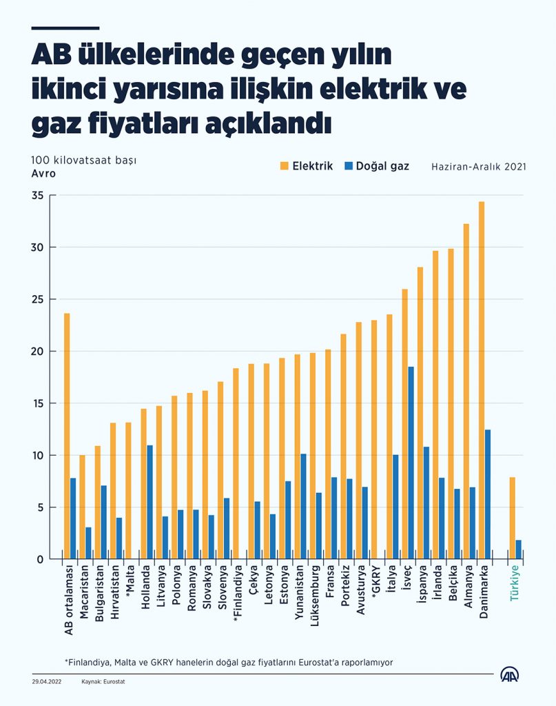 Avrupa İstatistik Ofisi (Eurostat), AB üyesi ülkelerde 2021’in ikinci yarısında konutlarda tüketilen elektrik ve doğal gaz fiyatlarına ilişkin verileri yayımladı.