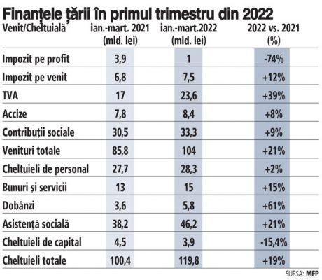 Genel olarak, konsolide genel bütçenin uygulanması Mart ayında keskin bir şekilde kötüleşti. Harcama arttıkça devlet gelirleri yavaşladı. Böylece, Finance tarafından yayınlanan belgeye göre, devlet gelir vergisinden elde edilen gelirler, 2022’de ilk sömestrde yüzde 74 azaldı. Bununla birlikte, aynı zamanda, KDV gelirleri neredeyse yüzde 40 artarak 24 milyar lei’ye yükselirken, sosyal katkı paylarından (emeklilik ve sağlık sigortası) gelen devlet gelirleri 2022’de 33 milyar ley (Yüzde 9) arttı.