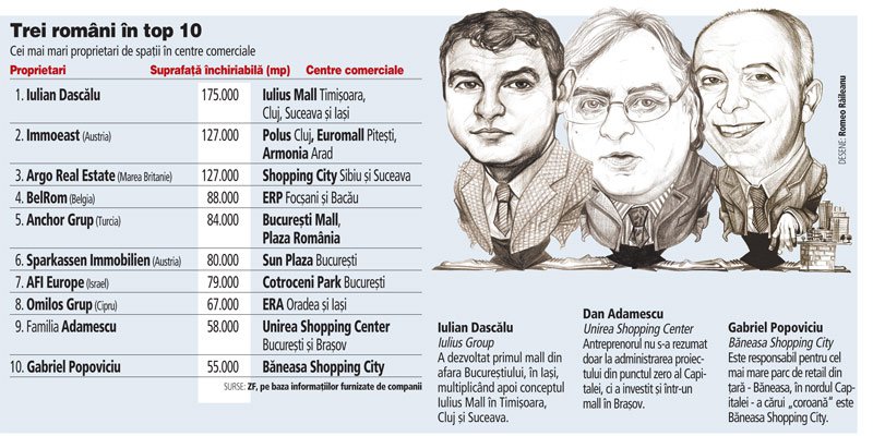 ZF gazetesinin haberine göre Romanya’da en iyi alışveriş merkezi sahipleri 100 hektar ticari alana sahip. İlk on sahip arasında üç Rumen var: Iulian Dascalu, Dan Adamescu ve Gabriel Popoviciu.