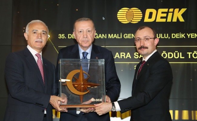 Ustalara saygı ödüllerinin sunulduğu törende, Cumhurbaşkanı Erdoğan’a “Kuzey Yıldızı” ödülünü, Ticaret Bakanı Muş ve DEİK Başkanı Olpak takdim etti.