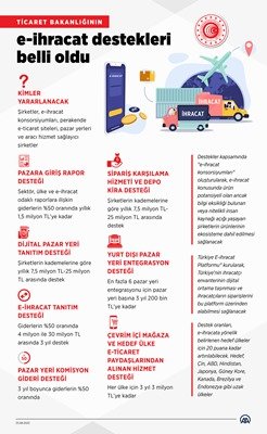 Destekler kapsamında “e-ihracat konsorsiyumları” oluşturularak, e-ihracat konusunda ürün potansiyeli olan ancak bilgi eksikliği bulunan veya nitelikli insan kaynağı açığı yaşayan şirketlerin ürünlerinin ekosisteme dahil edilmesi sağlanacak.