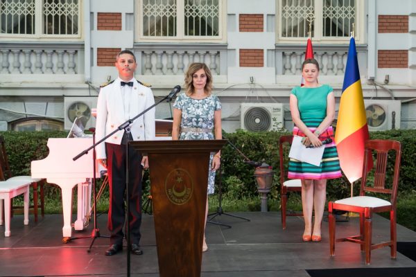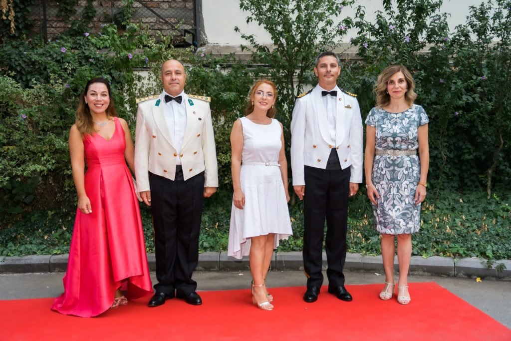 Bükreş Büyükelçiliğimiz bahçesinde Büyükelçi Füsun Aramaz’ın ev sahipliğinde gerçekleştirilen etkinliğin davetlileri Askeri Ataşeler Deniz Albay Alper Dilsiz, Albay Çağrı Sağlam ve eşleri tarafından karşılandı.