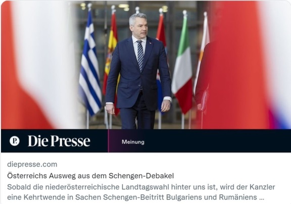 Avusturya gazetesi Die Presse, Başbakan Karl Nehammer’in Şubat ayında Romanya’yı Schengen’de bloke etme fikrini değiştireceğini öne sürerek, çünkü “Önemli hatanın farkına vardı” diye yazdı.