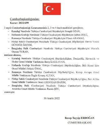 Bükreş Büyükelçisi olarak dört yıllık görev dönemimde bir yandan Romanya ile stratejik ortaklık seviyesindeki ilişkilerimizin her alanda ilerletilmesi doğrultusunda çaba gösterirken, diğer taraftan vatandaşlarımıza ve ortak tarihimizin nişanesi olarak gördüğümüz soydaşlarımıza yönelik hizmetlerimizle projelerimizi Köstence Başkonsolosluğumuz, bağlı Müşavirlik ve Ataşeliklerlerimiz,  Cluj, Yaş ve Tulça Fahri Başkonsolosluklarımız ile TİKA, Yunus Emre Enstitüsü, Maarif Vakfı kurumlarımızın destekleriyle sürdürdük. Türk İşadamları Derneği çatısı altındaki özel sektörümüz de her zaman yanımızdaydı ve desteğini esirgemedi. Bükreş Maarif Okulu ve Mecidiye Kemal Atatürk Ulusal Koleji’nin dahil olduğu eğitim işbirliklerimizi ilerlettik ve muhtelif üniversitelerde görev yapan Türkçe dersi okutmanlarımızla dilimizi Romanya’da öğretmeye devam ettik. Romanya ile ilişkilerimizin daha da geliştirilmesi yönündeki çabalar Cumhuriyetimizin 100. yılını kutlayacağımız 2023 yılında da devam edecektir.”