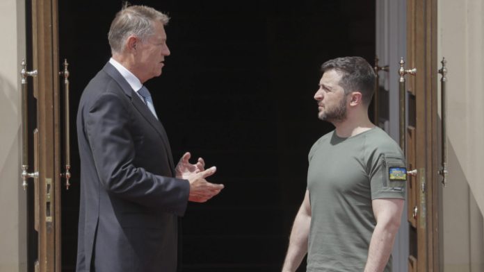 Fotoğraf – Ukrayna Devlet Başkanı Volodymyr Zelensky (sağda) Romanya Devlet Başkanı Klaus Iohannis (solda) ile 16 Haziran 2022’de Ukrayna’nın Kiev kentinde yaptıkları görüşmede. Fotoğraf: EPA/Sergey Dolzhenko