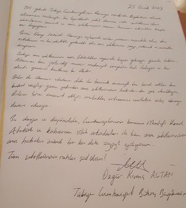 Büyükelçi Altan, daha sonra saat 17:00’de Bükreş Türk Şehitliği’ni ziyaret ederek Şehitlik Anıtı’na çelenk koyarak saygı duruşunda bulundu, Şehitlik Defteri’ni yazarak imzaladı. Büyükelçi Altan, burada kendisine eşlik eden Büyükelçilik mensuplarına ve Bükreş’teki Türk Kamu Kurumu temsilcilerine hitaben bir konuşma yaptı.