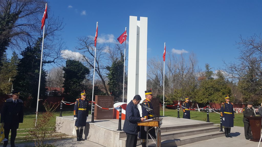Şehitlere saygı duruşu ve iki ülke istiklal marşlarının okunmasının ardından şehitlik Anıtı’na çelek bırakılarak saygı duruşu gerçekleştirildi.