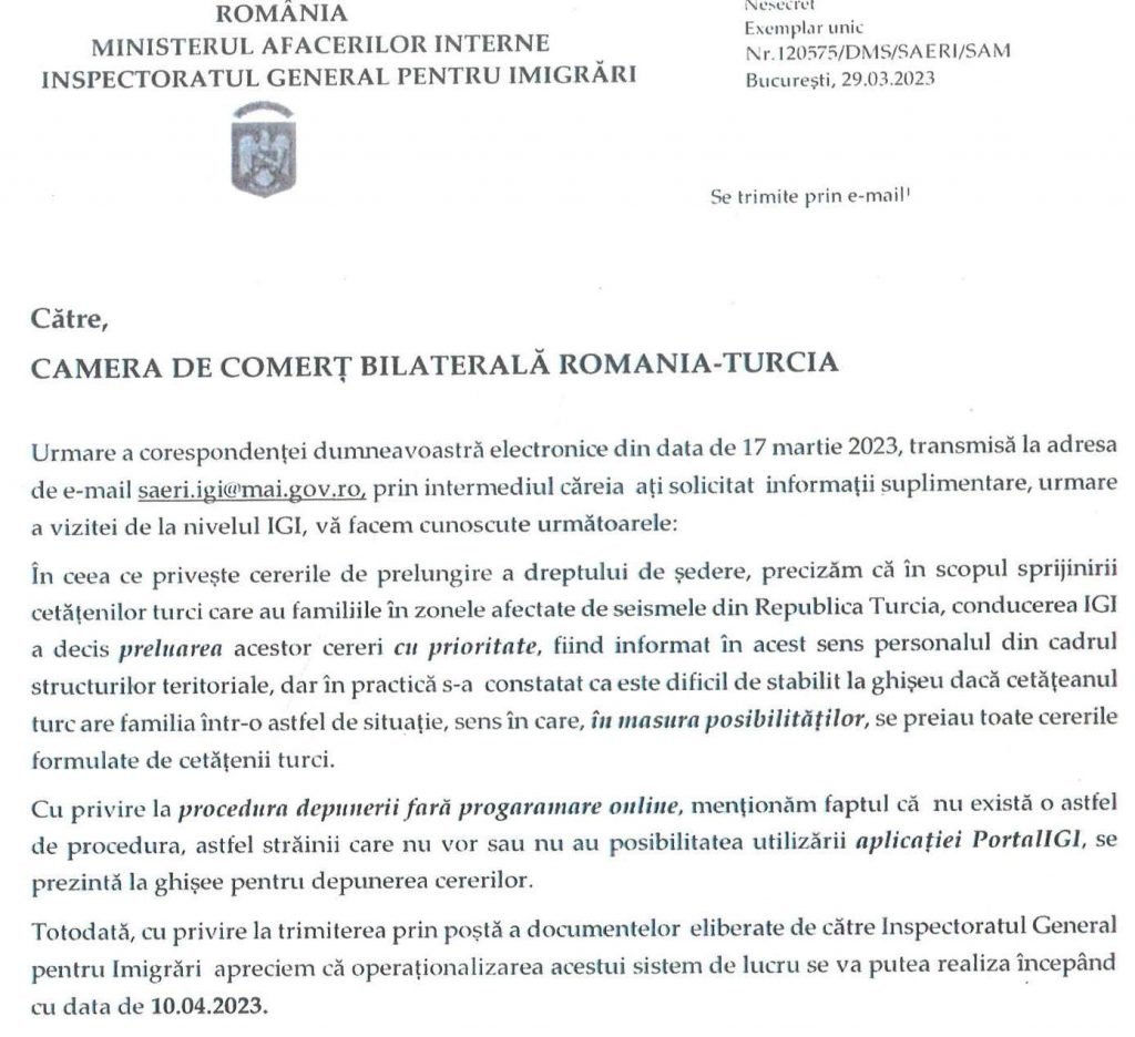 Romanya- Türkiye Ticaret ve Sanayi Odası Başkanı Tamer Atalay, Mart ayı başında Romanya Göçmenlik Ofisi Genel Müfettişliği (IGI) Genel Müfettişi General Liviu Bute ile yaptığı görüşmenin ardından yaptığı bilgilendirme sonrasında birçok vatandaştan gelen talep üzerine yeni başlayan uygulamalarla ilgili IGI yetkililerinden yazılı bir açıklama talebinde bulundu.