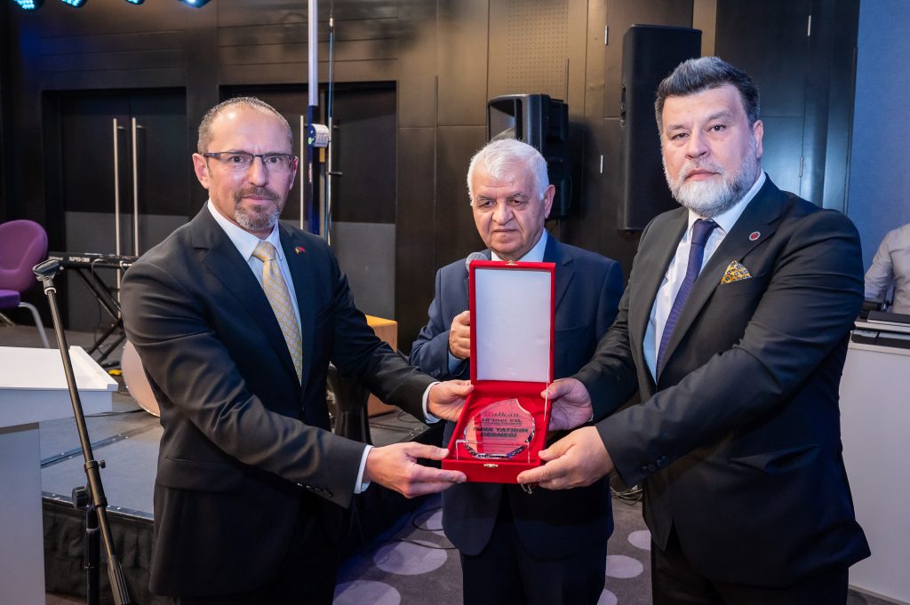 Küresel Gazeteciler Konseyi (KGK) Başkanı Mehmet Ali Dim, KGK Romanya Temsilcisi Hamdi Yılmaz’a Gazete Balkan’ın 18’inci yılı nedeniyle bir başarı plaketi verdi