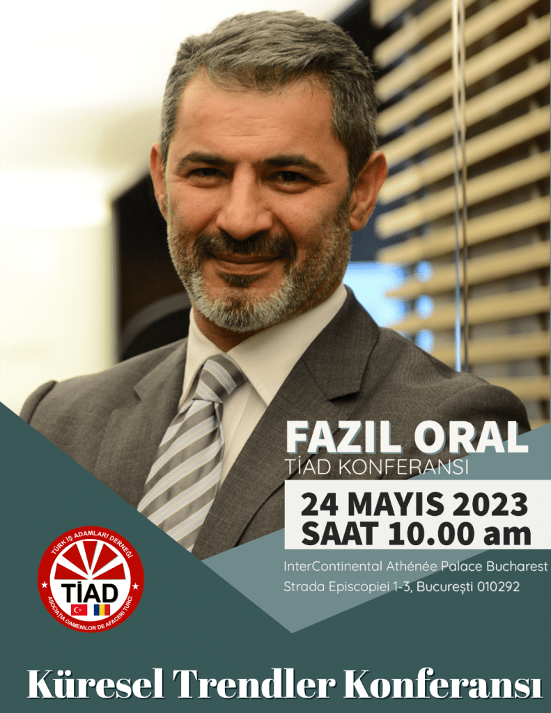 Son dönemde yaşanan uluslararası gelişmelerin Dünya Jeopolitiğine, ekonomiye ve firmalara etkisinin ele alınacağı, ‘Küresel Trendler’ temalı konferans TİAD organizasyonunda, Liderlik ve Yönetim Düşünürü Fazıl Oral tarafından, 24 Mayıs 2023, Çarşamba günü, saat 10:00’da, InterContinental Athénée Palace’da verilecek.