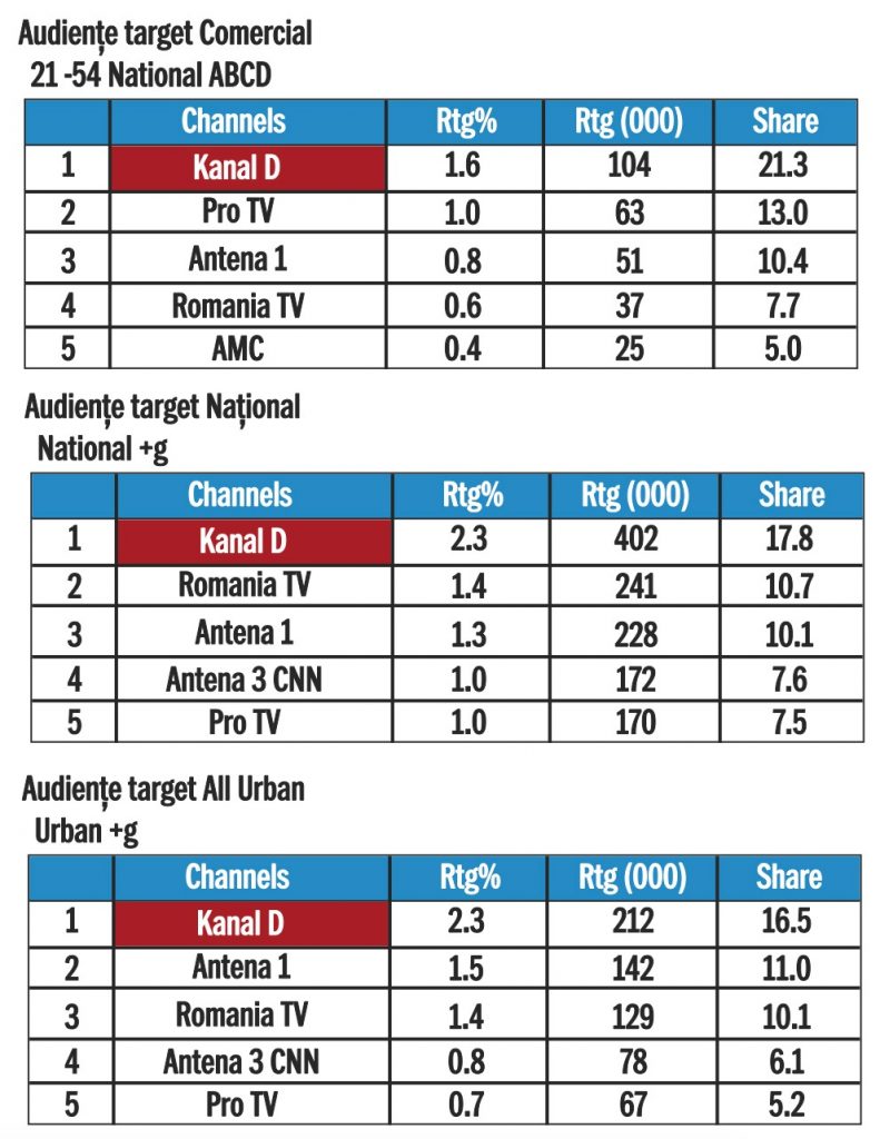 Kantar Media Romanya tarafından sağlanan verilere göre, 3 Ağustos Perşembe günü Kanal D Haber’in öğle haberleri ile Kanal D tüm izleyici segmentlerinde mutlak izleyici lideri oldu.
