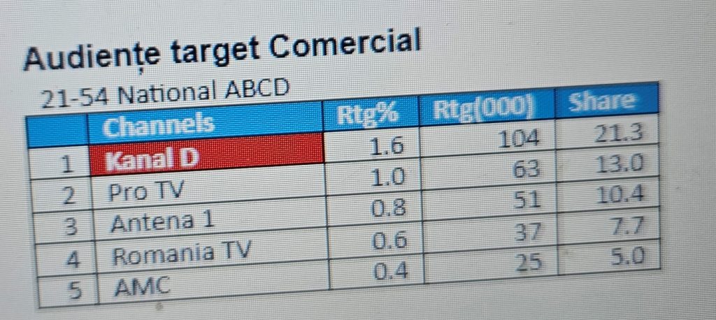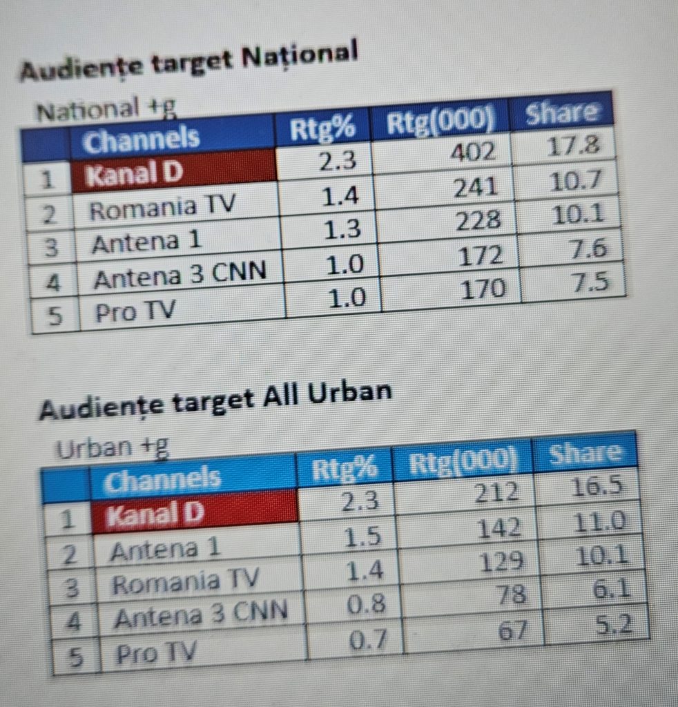 Kantar Media Romania tarafından sağlanan verilere göre, 8 Ağustos Salı günü saat 12:00’den itibaren yayınlanan Kanal D Haber ile izlenen tüm izleyici segmentlerinde Kanal D Romanya tartışmasız izlenme lideri oldu.