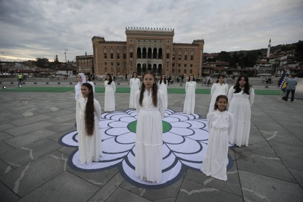 Tarihi Vijecnica Kütüphanesi önünde, Adresim Srebrenitsa Derneği tarafından Saraybosna Belediyesi katkılarıyla düzenlenen programda soykırımda hayatını kaybeden 8 bin 372 Boşnak sivili temsilen küçük tabutlar kurulurken Tuzla Sanat Akademisi öğrencileri ile Srebrenitsalı çocuklar performans sergiledi.
