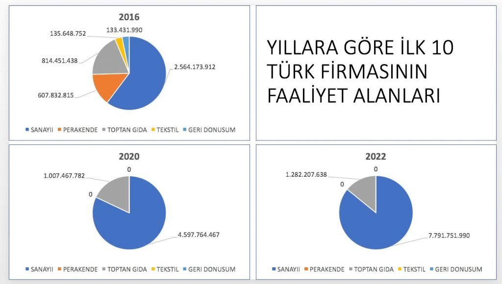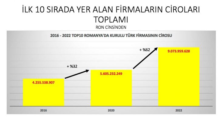 İlk ondaki firmaların isim ve niteliklerinden bağımsız olarak 2016 – 2022 döneminde genel ciro artışına paralel bir şekilde ciro artışı gösterdiklerini tespit ediyoruz. 2016’da 4,25 milyar ley seviyesinde olan ilk 10 firma cirosu 2022’de 9,1 milyar ley seviyesine çıkıyor.