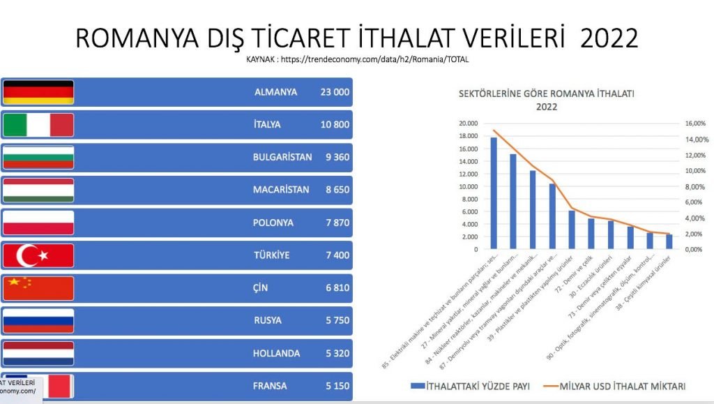 Aynı dönemde Türkiye’den yapılan ithalat 5 754 milyar dolardan 7 406 milyar dolara çıkmış. Bu yaklaşık yüzde 29’luk bir artışı ifade ediyor. Türkiye bu seviyeyle Romanya’nın altıncı en büyük ithalat partneri olarak sıralamada yerini alıyor.