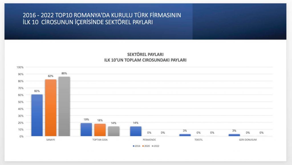 Dolayısıyla ilk ondaki firmayı incelediğimizde toplam oluşturulan artı değerin yarısını değerlendirmiş oluyoruz. 2016-2022 döneminde cirolara göre ilk 10’a giren firmaların, cirolarının sektör bazında dağılımını görüyoruz. 2016 yılında toplam 5 sektöre dağılmış olan ilk 10 firma cirosu 2022’ye geldiğimizde 2 sektöre iniyor. 2016’da sanayi perakende toptan gıda tekstil ve geri dönüşüm sektörleri ilk onda yer bulurken, 2022’de sadece sanayi ve toptan gıda sektörlerinin temsilcilerini görüyoruz. Burada önemli olarak not edilmesi gereken nokta, yeni giren firmaların özellikle sanayici olmaları ve bunların yüksek ciro onlarla listeye girmelidir. Romanya’ya son yıllarda yatırım yapan Türk firmalarının sanayici olarak cirolarını önemli şekilde artırdıklarını tespit edebiliyoruz.
