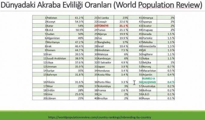 Dünya genelinde en çok akraba evliliği oranı yüzde 61,2 oranı ile Pakistan’da olurken ikinci sırada yüzde 54,3 oranı ile Kuveyt yer aldı. 60 ülkenin yer aldığı listede Türkiye yüzde 21,1 oranı ile 23’üncü sırada yer aldı.