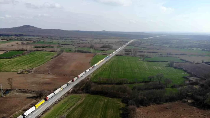 Edirne’de Hamzabeyli Sınır Kapısı’nda Pazartesi günü ihracat yüklerini götürmek için bekleyen tır sürücüleri kilometrelerce kuyruk oluşturdu.