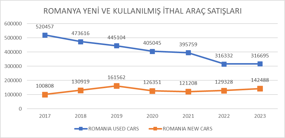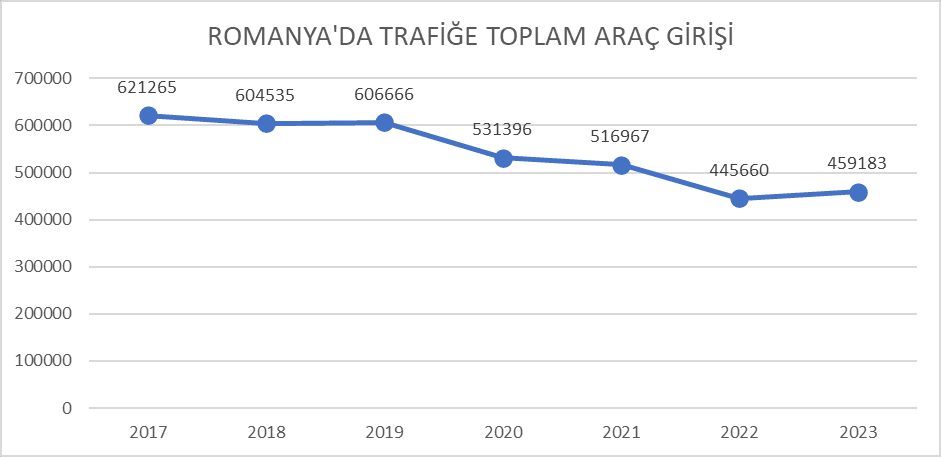 Şekil 3 2017 – 2023 Yılları arasında Romanya’da trafiğe giren yeni araç satışları ve ikinci el otomobil ithalatı rakkamlarının toplamı