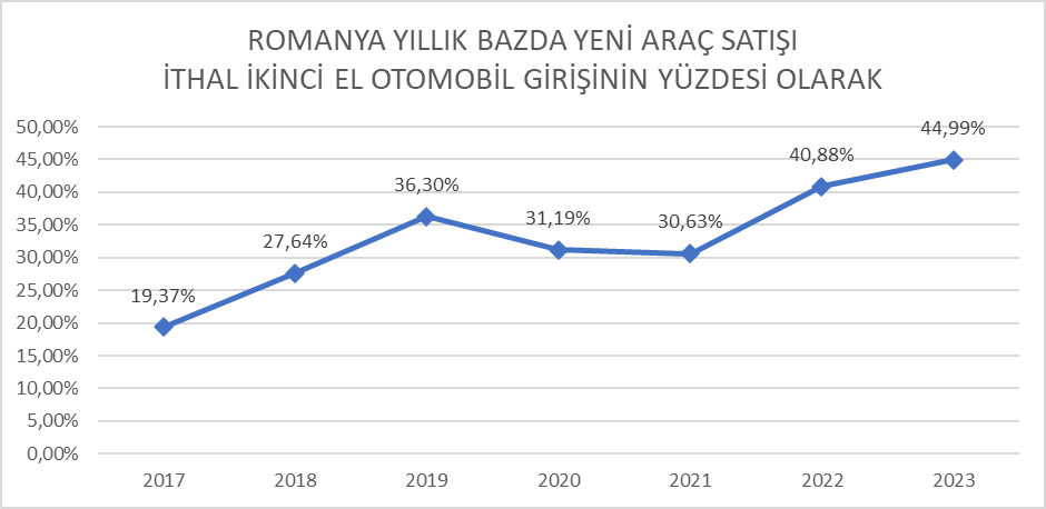 Şekil 1’de yer alan grafikte 2017 yılından bu yana Romanya pazarına giriş yapan, ikinci el ve sıfır araçların adetler olarak yıllık bazda gelişimini görüyoruz. Grafiğin verdiği önemli bilgilerden bir tanesi sıfır araç satışlarıyla ikinci el ithalat arasındaki makasın giderek kapanmakta olduğu bilgisidir. Bu gelişimi daha iyi gözlemlemek adına Şekil 2’ye bakmak gerekiyor. Bu grafikte Romanya’da yıllık bazda trafiğe giren 0 km yeni araçların ikinci el araçlara göre yüzdesel ifadesi yer alıyor. 2023’te %45 olarak ifade edilen değer o yılın yeni araç satışı miktarı olan 142.488’i yine aynı yılın ikinci el araç ithalat miktarı olarak verilen 316.695’e bölerek elde ediliyor. Dolayısıyla bu yüzde ne kadar büyük olursa yeni araçların satış imkanının o kadar fazlalaştığı anlıyoruz. 2017 yılında % 20’nin altında olan bu seviyenin 2023’te %45 seviyesine çıkması Romanya otomotiv sanayi ve sektörü adına aslında güzel bir gelişme olarak görülmelidir. Eski araçların trafiğe girmesi Romanya ‘nın toplamdaki karbon emisyonunu olumlu