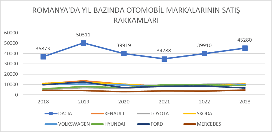 Şekil 5 DACIA markasının dışındaki markalara baktığımızda Romanya’da yeni otomobil satışlarında markaların pazardaki adetlerinin yılara göre değişimi