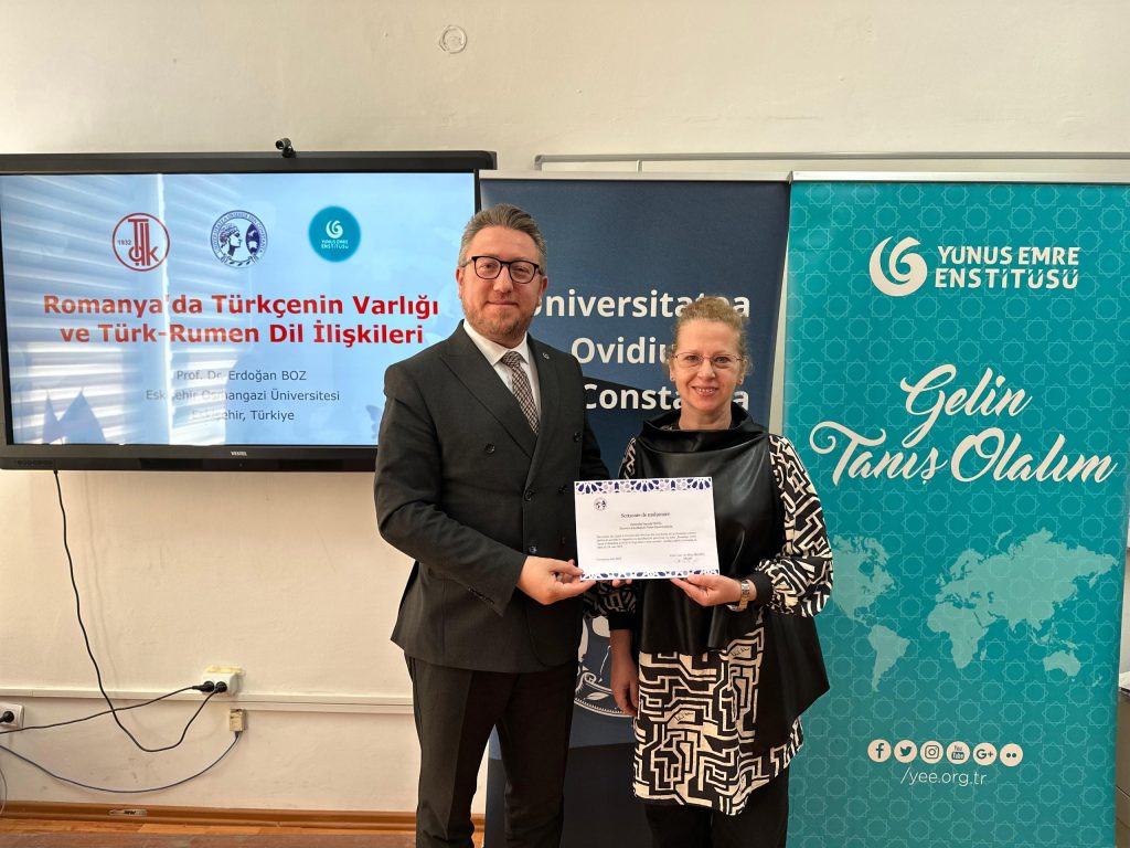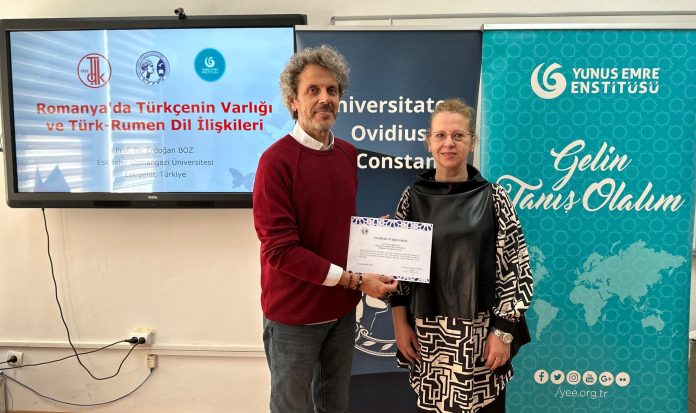 Yunus Emre Enstitüsü ve Köstence Ovidius Üniversitesi Edebiyat Fakültesi tarafından, Türk Hava Yolları ve Türk Dil Kurumunun katkılarıyla gerçekleştirilen “Romanya’daki Türkçe Varlığı, Türk-Rumen Dil İlişkileri” konulu konferans, Eskişehir Osmangazi Üniversitesi Yeni Türk Dili Anabilim Dalı Başkanı Prof. Dr. Erdoğan Boz tarafından verildi.