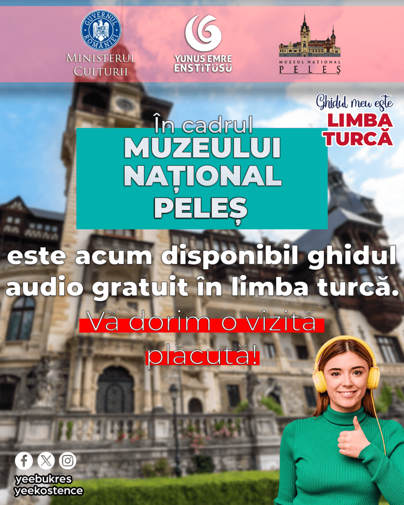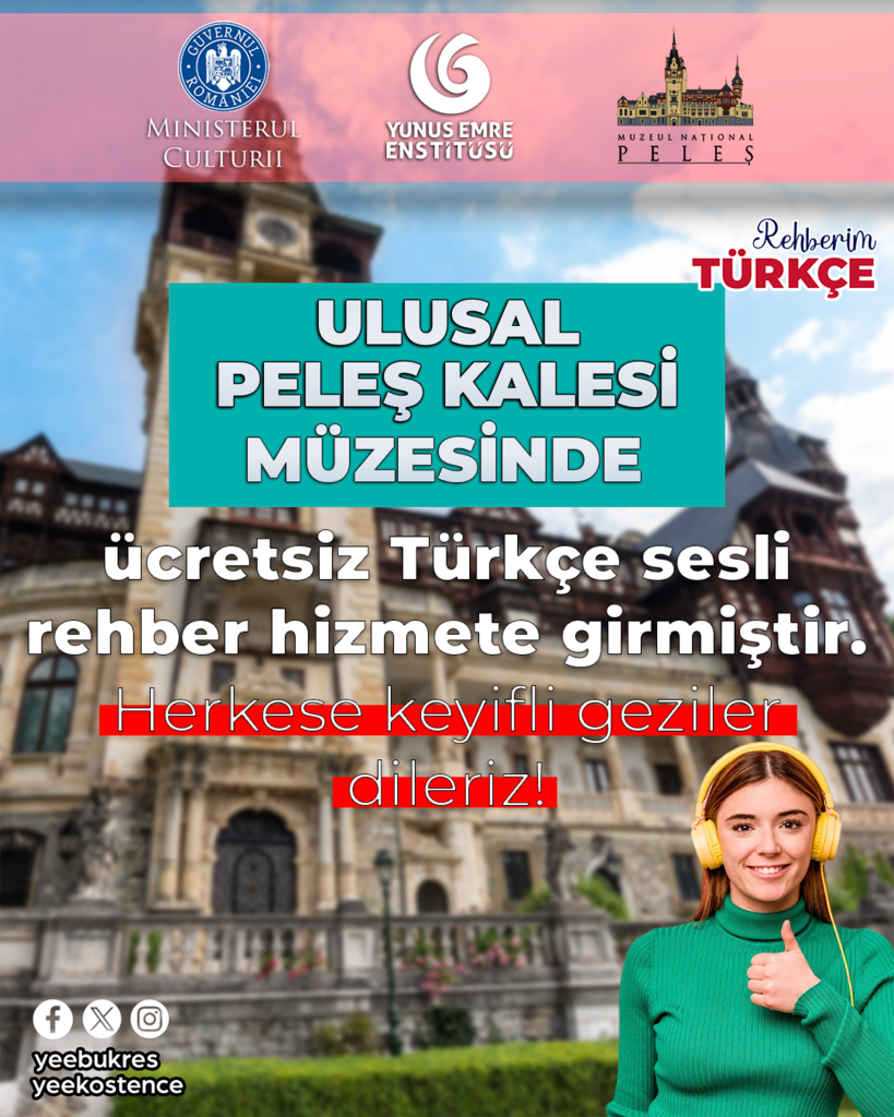 Romanya Kültür Bakanlığı ve Romanya Yunus Emre Enstitüsü iş birliğiyle yürütülen “Rehberim Türkçe Projesi” kapsamında, Romanya’daki müzelerde bulunan bilgi notları, basılı materyaller ve sesli rehberler, Yunus Emre Enstitüsü desteğiyle Türkçeye tercüme ediliyor. Bu müzelerden birisi olan ve yılda yaklaşık bir milyon kişinin ziyaret ettiği Peleş Kalesi Müzesinde ziyaretçiler artık basılı materyallerin yanı sıra sesli rehber aracılığıyla da müzeyi Türkçe olarak gezebiliyor.