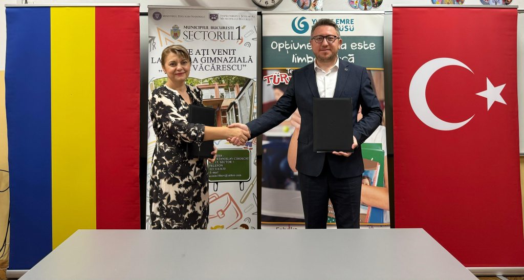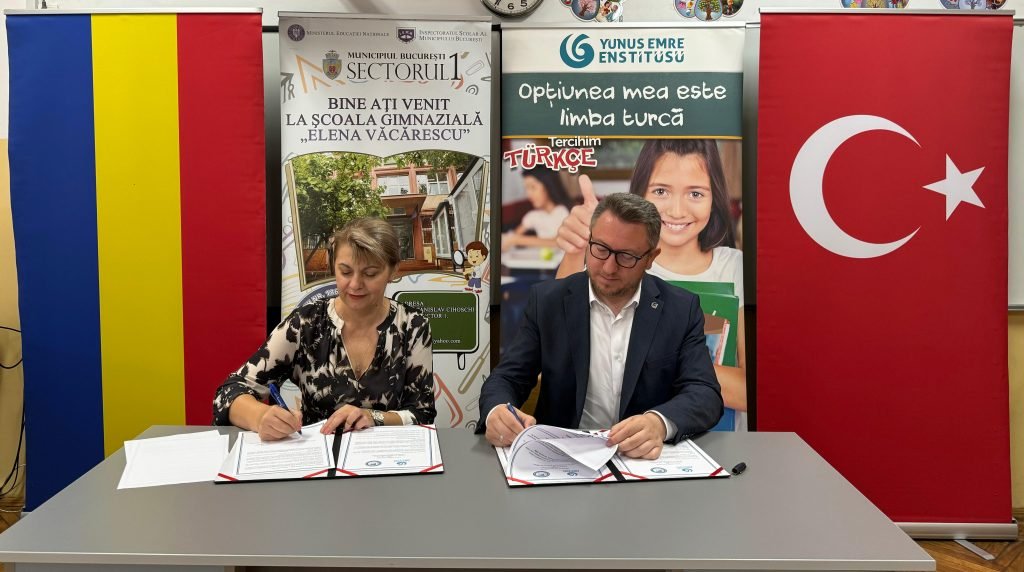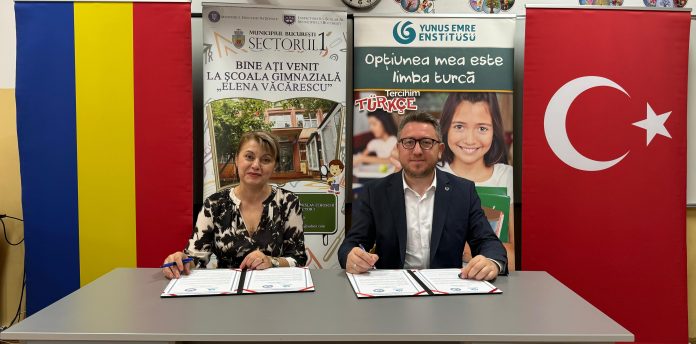 Romanya’nın en bilinen eğitim kurumları tarafından yoğun ilgiyle karşılanan Tercihim Türkçe Projesi’ne okullar katılmaya devam ediyor. Bugün imzalanan protokol ile Bükreş’in marka okullarından Elena Vacarescu Ortaokulu da projeye katılmış oldu. Yaklaşık bin öğrencisi olan okuldan ciddi sayıda Türkçeyi seçecek öğrenci bulunuyor.