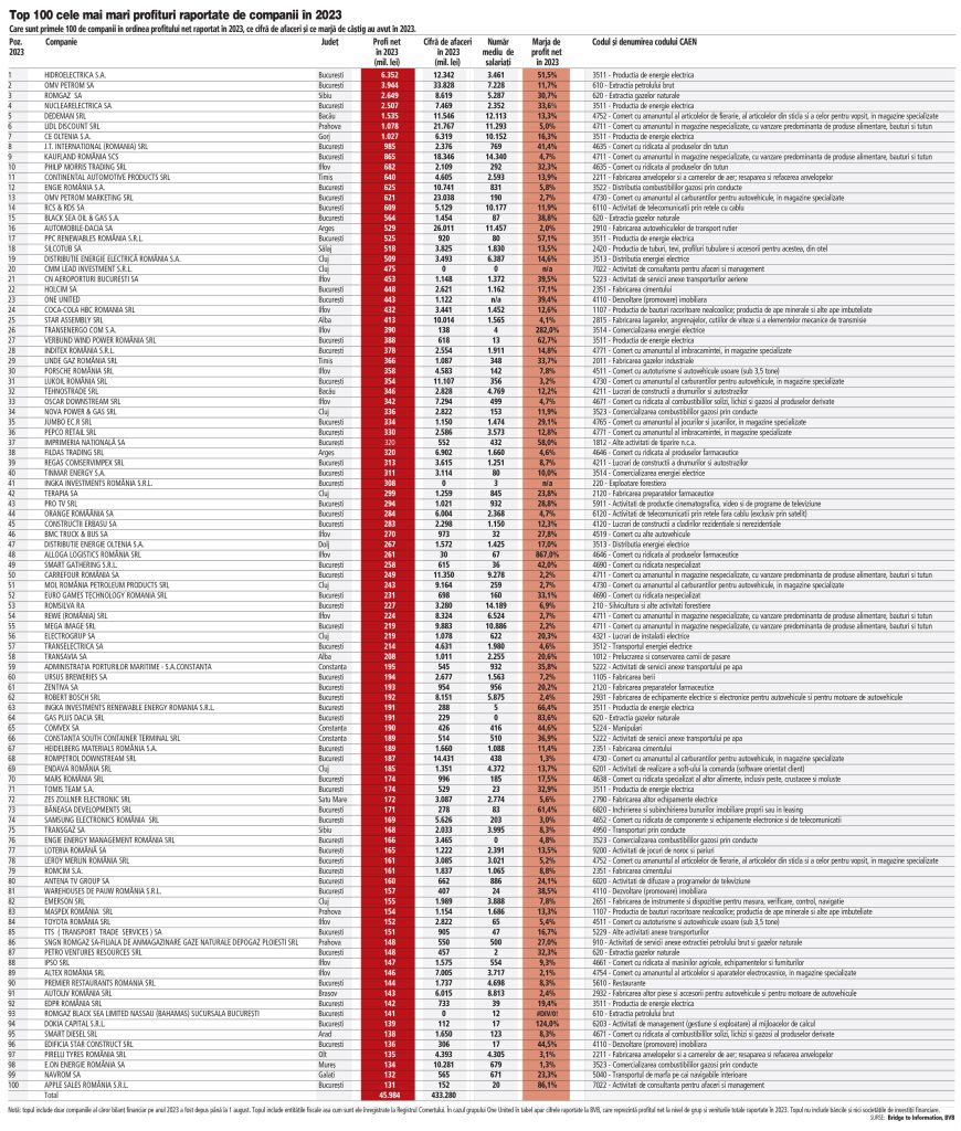 ZF’de Miera Diaconu’nun haberinde Brige to Information platformuna dayandırdığı verilere göre kârlılıkta ilk sırada 6,3 milyar ley (1,27 milyar Euro) kâr elde eden Hidroelectrica oldu. Şirket bir önceki yıl ise 4,3 milyar Ley kâr elde etmişti.