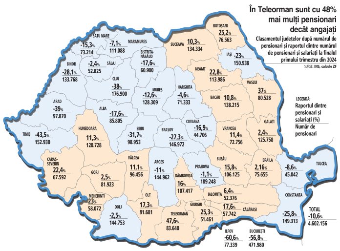 ZF’nin Ulusal İstatistik Enstitüsü’nün (INS) verilerine dayanarak yaptığı hesaplamalara göre, Romanya’daki 20 ilde emeklilerin sayısı çalışanlardan daha fazla. Bu nedenle, ülkedeki illerin ancak yarısında şirketlerdeki işgücü, emeklilerin sayısından fazladır.