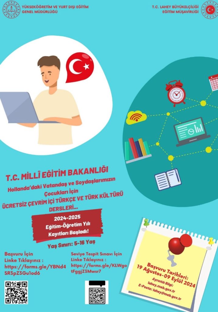Hollanda’da ilk kez bu yılın şubat ayında başlatılan dersler, Eğitim Bakanlığı bünyesinde görevli, alanında uzman öğretmenler tarafından, hafta sonları uzaktan eğitim yoluyla verilmekte olan Türkçe derslere çocuklarını kaydetmek isteyen veliler, alttaki afişte görülen karekodları okutarak kaydolmayı deneyebilirler..