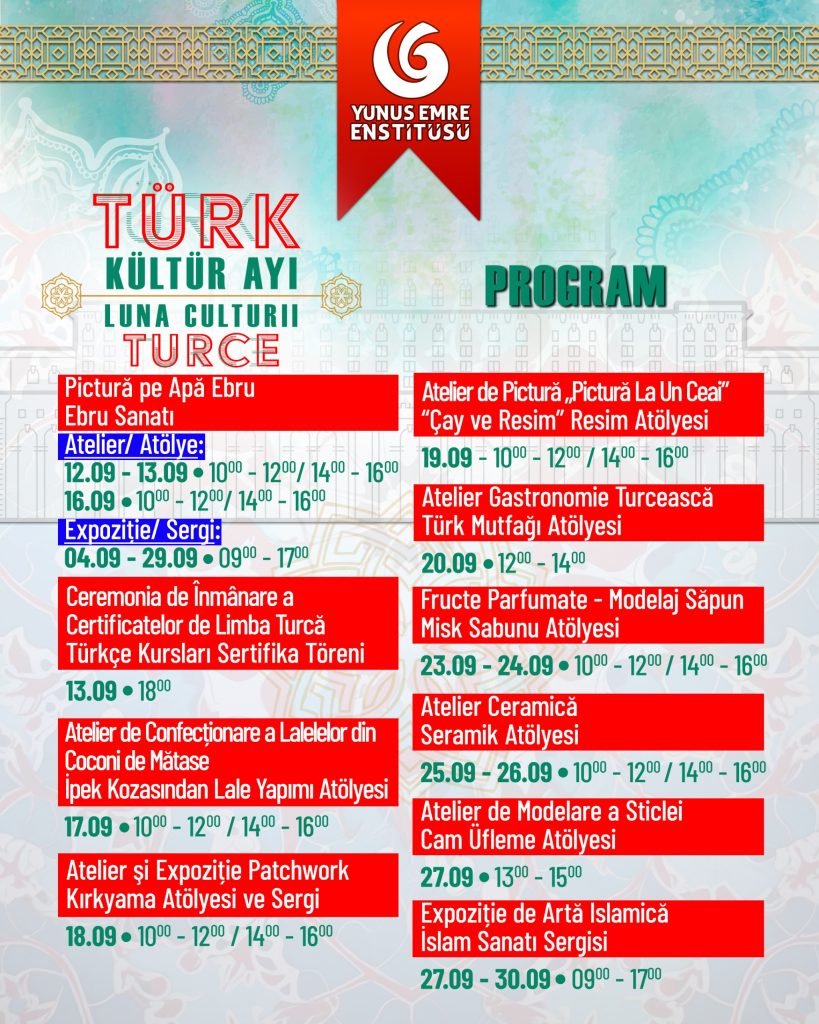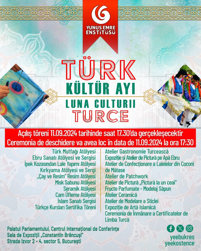 Yunus Emre Enstitüsü Bükreş Şubesi yeni dönem etkinliklerini başlatıyor. Konuyla ilgili Yunus Emre Enstitüsü’nden yapılan açıklama aynen şöyle: