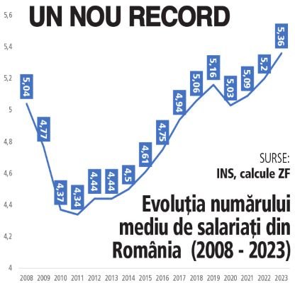 Ziarul Financiar gazetesi tarafından haberleştirilen Romanya İstatistik Enstitüsü (INS) istatistiklerine göre, geçen yıl yerel işgücü piyasasında ortalama 5,36 milyondan fazla çalışan vardı; veriler son 16 yıldaki en büyük çalışan sayısıydı. 2022 ile karşılaştırıldığında 2023 yılında ortalama çalışan sayısı yüzde 3 arttı.