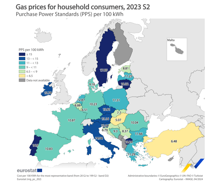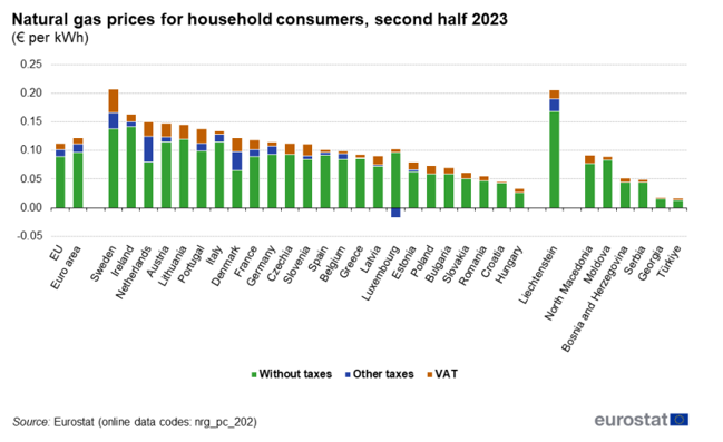 2023 yılının ikinci yarısında doğal gaz fiyatları en yüksek İsveç, İrlanda ve Hollanda’da, en düşük ise Macaristan, Hırvatistan ve Romanya’da görüldü. İsveç’te hane halkı için doğalgaz fiyatı Macaristan’daki fiyatın altı katından fazla ve AB ortalama fiyatından %84 daha yüksekti.