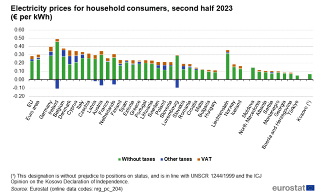 Avro cinsinden ifade edildiğinde, 2023 yılının ikinci yarısında ortalama ev elektrik fiyatları en düşük Macaristan (100 kWh başına 11,3 Avro), Bulgaristan (11,9 Avro) ve Malta’da (12,8 Avro) olurken, en yüksek Almanya (40,2 Avro) ve İrlanda’da (37.9 Avro) ve Belçika’da (37,8 Avro) oldu.