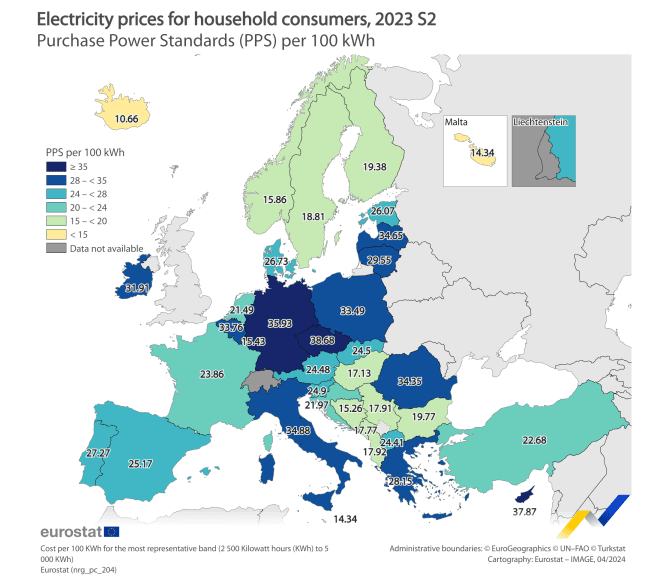 2023’ün ikinci yarısında ev tüketicilerine yönelik elektrik fiyatları, mevcut ülkeleri altı kategoride gruplandıran satın alma gücü standardında (PPS) sunulmaktadır; elektrik fiyat kategorileri 100 KWh başına 35 PPS’den 100 KWh başına 15 PPS’nin altına kadar değişmektedir. Tüketicinin üzerindeki nihai yük ise kendi tüketimine bağlıdır. PPS bazında elektrik fiyatları en yüksek Çek Cumhuriyeti’nde (38,7) ve Güney Kıbrıs’ta (37,9) görüldü. Satın alma gücü standardına göre en düşük elektrik fiyatları ise Malta (14,3) ve Lüksemburg’da (15,4) görüldü.