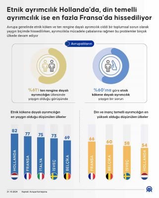 Avrupa ülkeleri arasında etnik kökene dayalı ayrımcılığın en çok hissedildiği ülkeler yüzde 82 ile Hollanda, yüzde 77 ile Fransa, yüzde 75 ile İtalya, yüzde 73 ile İsveç ve yüzde 69 ile Belçika olarak öne çıkıyor.