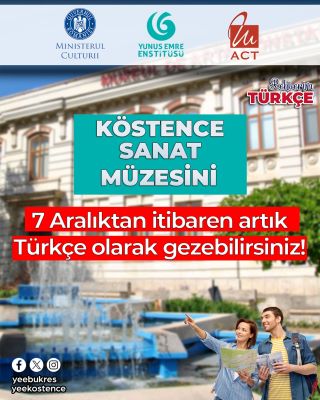 7 Aralık 2024 tarihinde ise Romanya’nın önemli sanat müzelerinden olan Köstence Sanat Müzesi de artık Türkçe olarak gezilebilecek. Müzedeki tüm bilgi notları Yunus Emre Enstitüsünün desteği ile Türkçeleştirildi. T.C. Köstence Başkonsolosu Sayın Ozan Çakır, Yunus Emre Enstitüsü Romanya Müdürü Mustafa Yıldız ve çok sayıda seçkin davetlinin katılımıyla açılışı yapılacaktır. Proje Romanya’daki bütün müzelerin Türkçeleştirilmesiyle nihayete erecektir.