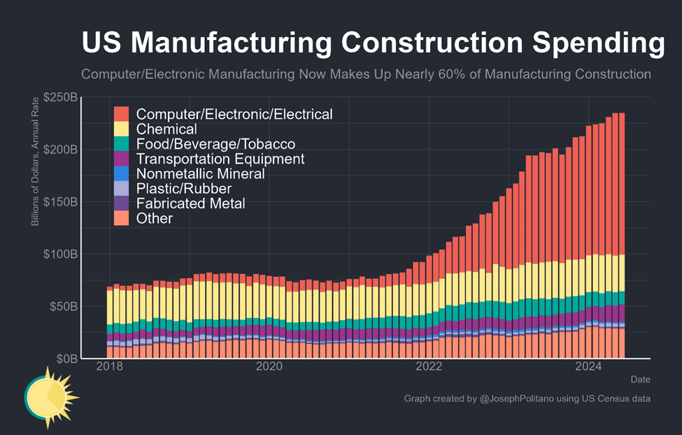 Şekil 6 – ABD Fabrika yatırımlarının yıllık ortalama gelişimi : Joseph Politano tarafından ABD İstatistik Kurumu verilerinden derlenen grafik, pandemi öncesinde yıllık ortalama 60-65 milyar dolar bandında gezen endüstriyel yatırımların CHIPS ACT sonrasında 250 milyar dolar seviyesine ulaştığı görülüyor. ABD CHIPS ACT ile endüstriyel yatırımlarını 4 katına çıkararak yeniden sanayileşme hareketini başlatmış görünüyor.