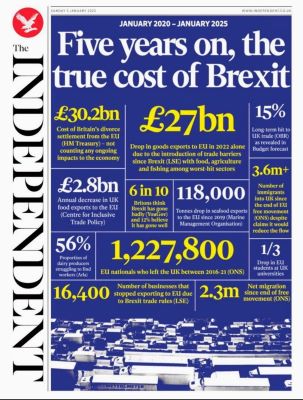 İnternette dolaşırken The Independent gazetesinin bu infografiğiyle karşılaştım. Brexit’in üzerinden 5 yıl geçmişken İngiltere ekonomisinin bu süreçte ne kadar ciddi bir fatura ödediği açıkça görülüyor. Siyasi bir karar olarak alınan bu ayrılığın ekonomik ve sosyal sonuçlarını rakamlarla değerlendirmek çok şey anlatıyor. İşte dikkat çeken veriler:
